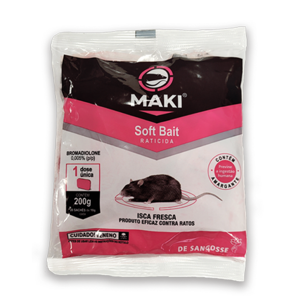 MAKI SOFT BAIT é uma isca macia altamente eficaz para o controle de ratos, formulada com Bromadiolone 0,005%. Sua atratividade superior garante uma rápida aceitação pelos roedores, superando outros raticidas no mercado.
